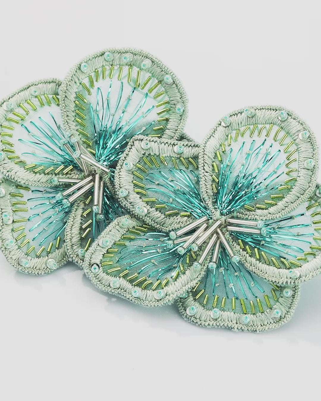 Embodying the essence of Palm Beach, these hand-embroidered floral earrings showcase exquisite craftsmanship. Delicately crafted from mint organza and enhanced with metallic bullion, these earrings captivate with intricate thread work and delicate beading. The malleable statement studs have become a team favorite, perfect for pairing with crochet dresses or silk gowns. Let these earrings elevate your ensemble, adding a touch of elegance and charm to your look.
